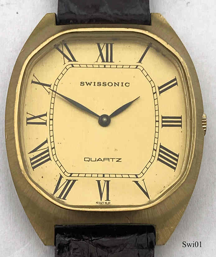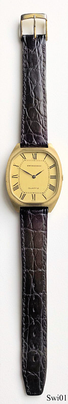 Eine Swissonic Quartzuhr, römische Ziffern auf goldfarbenem Zifferblatt. Aufschrift vorn: “Swissonic, Quartz, Swiss”, hinten: ”Base Metal Bezel, Stainless Steel Back, Swiss, 5600.3, 38”, innen: “Unadjusted, ESA 9220, Five (5) Jewels, Swiss”, Braunes Lederarmband.