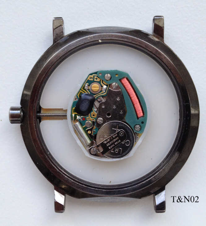 Eine schlichte, sehr einfache Quartz Armbanduhr im T&N Bahnhofsuhr Design mit Base Metal Gehäuse und Stainless Steel Back. Beschriftung vorn: ”TN”, Rückseite: ”3 ATM Water Resistant, Base Metal Bezel, Stainless Steel Back”, innen: “Swiss Parts, Unadjusted, one 1 Jewel, 502.101”