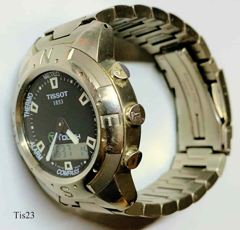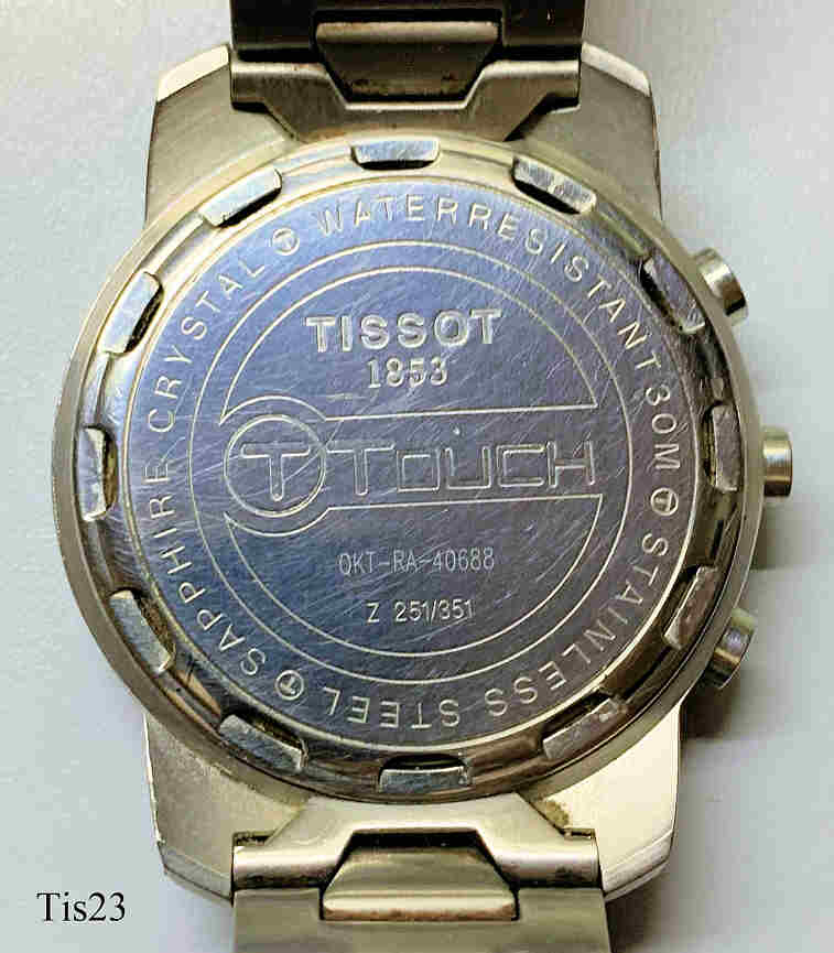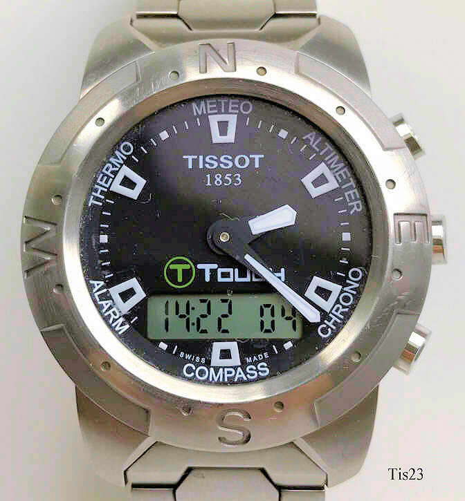 Eine Tissot T-Touch Multifunktionsuhr. Werk Caliber ETA E40.301, Edelstahlgehäuse. Beschriftet vorn : ”Tissot, 1853, T-Touch, Swiss Made, Thermo, Meteo, Altimeter, Alarm, Compass, Chrono”, innen: “ETA E40.301, 12 Jewels, Swiss Made V8, Battery CR1632, 16x3,2, 3V”, hinten: ”Sapphire Chrystal, Water Resistant 30M, Stainless Steel, Tissot 1853, T-Touch, Smart Watch, QKT-RA-40688, Z251/351”. Über der 6 ein LCD Display für die Funktionsanzeigen. Die Uhr hat einen Magnet-, Thermo- und Luftdrucksensor, mit denen sie folgende Funktionen anzeigen kann: Luftdruck (Meteo), Höhe (Altimeter), Temperatur (Thermo), Kompass (Compass), sowie Alarm, Chrono, Datum und Zeit. Die Auswahl der Funktion erfolgt über den Touchscreen, der durch Druck auf den mittleren Drücker aktiviert wird, dann berührt man das Glas an der Stelle der gewünschten Funktion. Die Zeiger zeigen dann gemeinsam auf die gewählte Funktion und der entsprechende Wert wird in dem LCD Display angezeigt. Bei Kompass bilden die Zeiger eine Linie und der Minutenzeiger zeigt auf “Nord”, das Display zeigt die eingegebene magnetische Korrektur an.