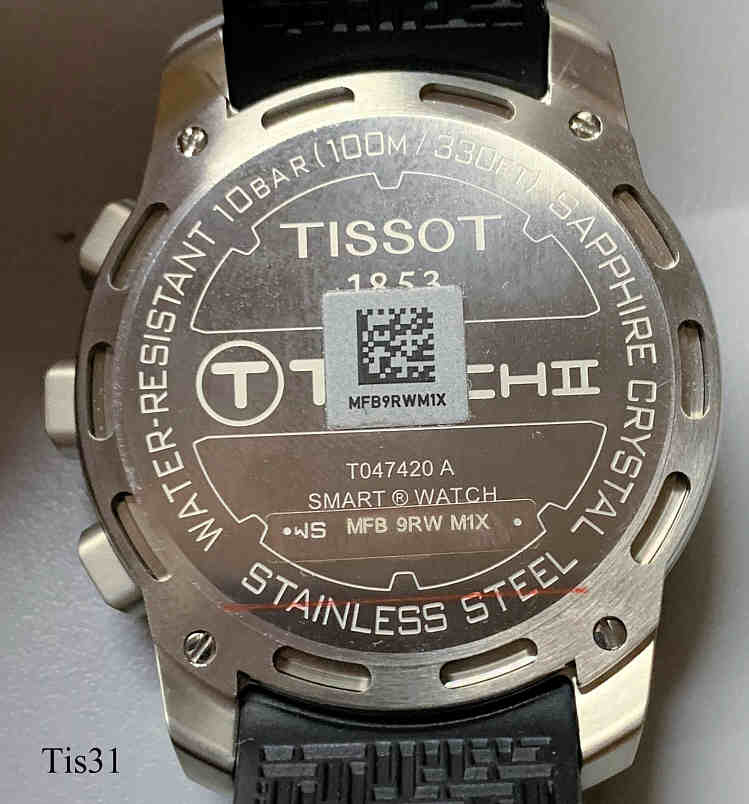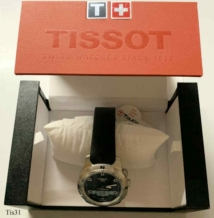 Eine Tissot T-Touch II Multifunktionsuhr. Werk Caliber T047420 A, Edelstahlgehäuse. Beschriftet vorn: ”Tissot, 1853, T-Touch, Swiss Made, Thermo, Meteo, Altimeter, Alarm, Compass, Chrono”, innen: “ ”, hinten: ”Sapphire Chrystal, Water Resistant 10Bar (100M/330Ft), Stainless Steel, Tissot 1853, T-Touch II, T47420A, Smart Watch, WS MFB 9RW M1X,”. Über der 6 ein LCD Display für die Funktionsanzeigen. Die Uhr hat einen Magnet-, Thermo- und Luftdrucksensor, mit denen sie folgende Funktionen anzeigen kann: Luftdruck (Meteo), Höhe (Altimeter), Temperatur (Thermo), Kompass (Compass), sowie Alarm, Chrono, Datum und Zeit. Die Auswahl der Funktion erfolgt über den Touchscreen, der durch Druck auf den mittleren Drücker aktiviert wird, dann berührt man das Glas an der Stelle der gewünschten Funktion. Die Zeiger zeigen dann gemeinsam auf die gewählte Funktion und der entsprechende Wert wird in dem LCD Display angezeigt. Bei Kompass bilden die Zeiger eine Linie und der Minutenzeiger zeigt auf “Nord”, das Display zeigt die Gradzahl an.