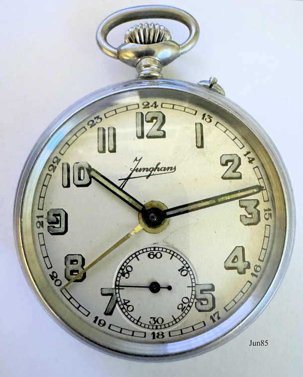 Eine Junghans Taschenuhr mit Wecker Funktion. Gehäuse Base Metall, Kaliber J36. Beschriftet vorn: “Junghans” Innen: ”Logo, J36, 20635”, hinten: “ ” Kaliber J36. Über den gezahnten Knop auf der Innenseite wird die Weckzeit eingestellt, sichtbar deurch den silbernen Zeiger bei der 8. Der Schieber “Stop / Alarm” schaltet die Alarmfunktion ein. Der Weckton wird erzeugt durch einen Stempel, der gegen die Gehäusewand schlägt. |