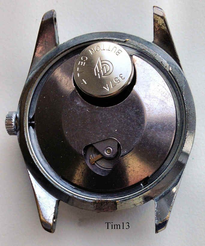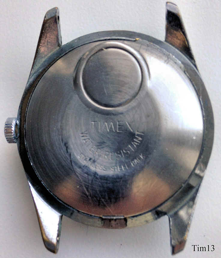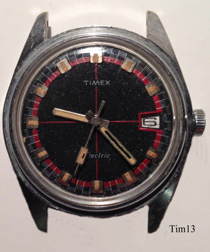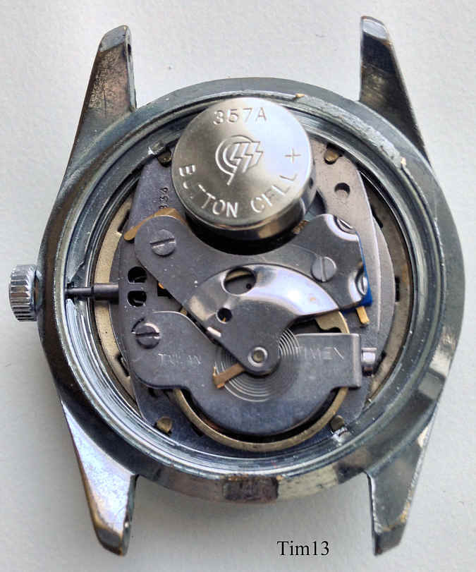 A Timex electric, one of the first electric watches, where the battery only substitutes the mainspring. The balance is drawn into the magnetic field of a permanent magnet by an electrical coil, via contacts the current is switched off, the balance swings back, the current is switched on again......Signed front: “Timex, Electric”, back: “Timex, Water Resistant, Stainless Steel Back”, inside: “Taiwan, Timex, 336”.Date at 3. |