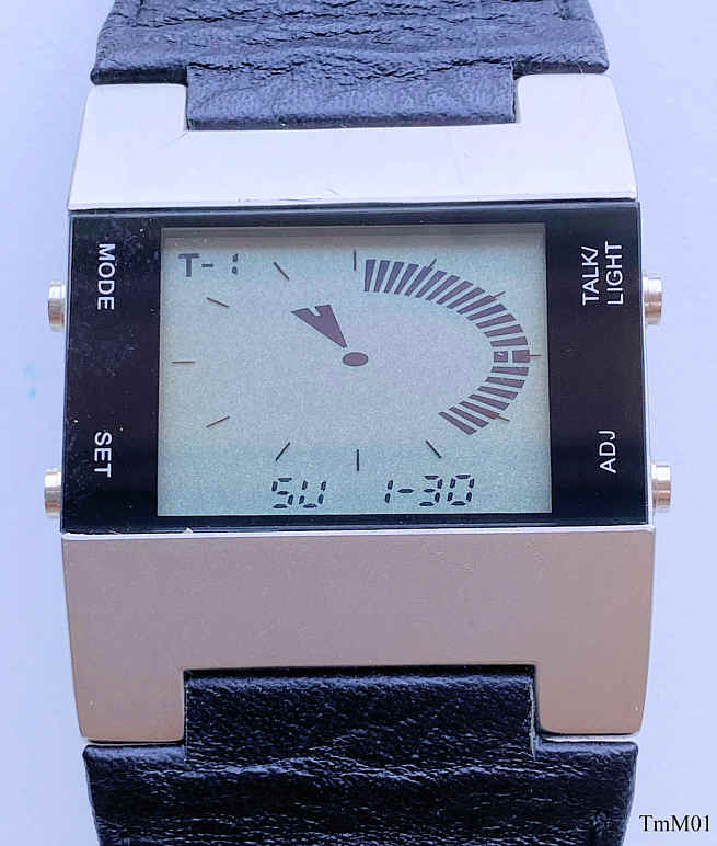 Dies ist eine Time Machine LCD Uhr, Modell “Time Warp”, mit etwas anderer Anzeige und Sprachausgabe. Funktionen: Time 1, Time 2, Weckzeit 1, Weckzeit 2, Datum, Kaleidoskop, Roulette. Sprachausgabe in Deutsch. Der Lautsprecher ist in der Rückwand. Keine Beschriftung. Base Metal Gehäuse, Edelstahlboden, Lederarmband mit neutraler Schließe.