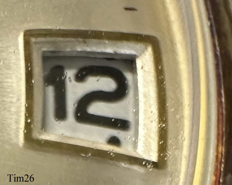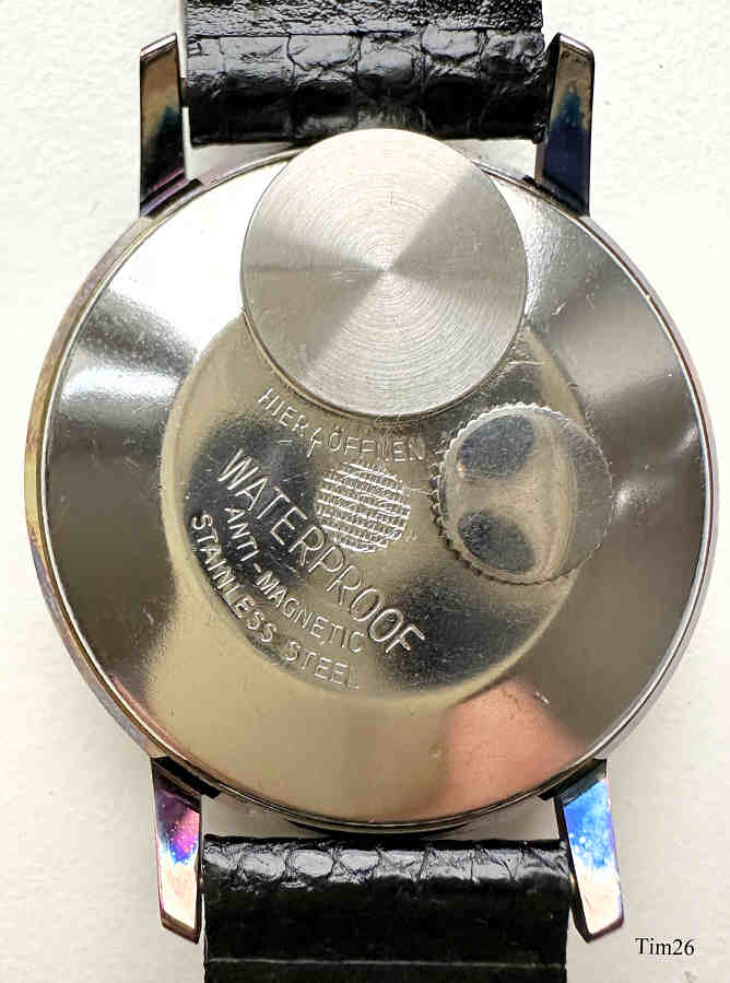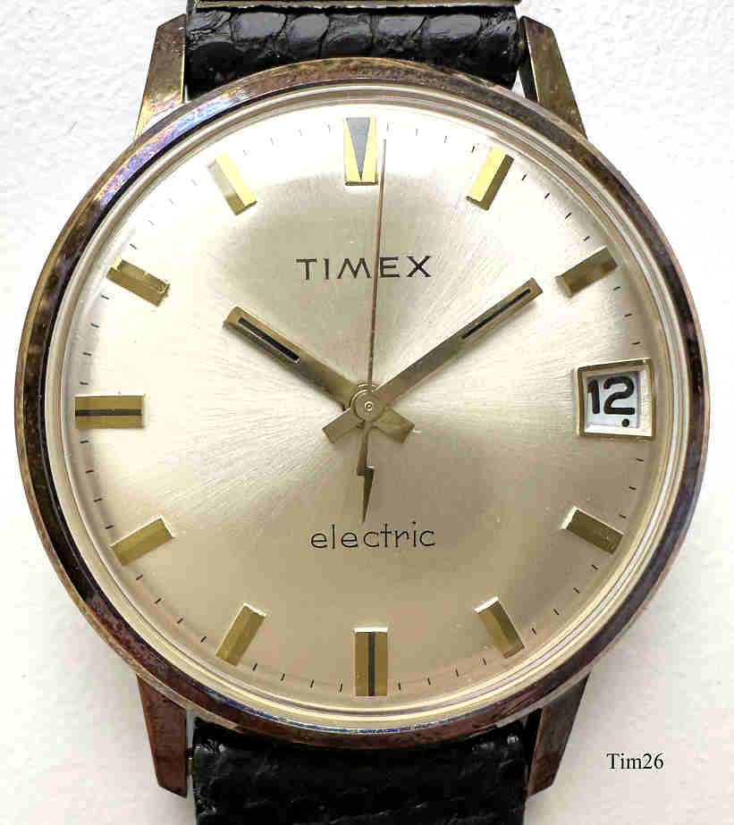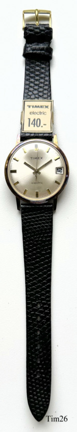 Dies ist eine Timex electric 85, eine der frühen elektrischen Armbanduhren, bei denen die Batterie nur die Aufzugsfeder ersetzt. Die Unruhe wird über eine elektrisch angesteuerte Spule in ein Magnetfeld gezogen, über Kontakte wird der Stromkreis unterbrochen, die Unruhe schwingt zurück, der Stromkreis wird wieder geschlossen......Modell 85 ist das Modell 84 mit einem zusätzlichen Kalender. Interessant ist die springende Sekunde und vor Allem die Kalenderanzeige. Hier zeigt ein Punkt unter der Zahl den Vormittag, ein Punkt über der Zahl den Nachmittag an. Keine Krone, gestellt wird am Rändelrad auf der Rückseite. Die Uhr hat ein sehr einfaches Gehäuse, wie bei Timex üblich. Herstellungsdatum ist 1958. Bezeichnet vorn: “Timex, Electric”, hinten: “Waterproof, Antimagnetic, Stainless Steel ”, innen: “West Germany, Seven 7 Jewels, 881”.