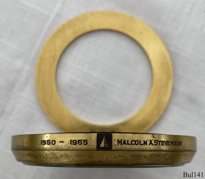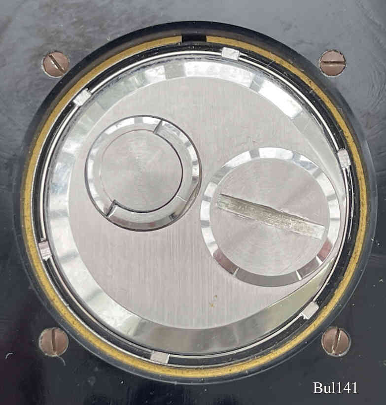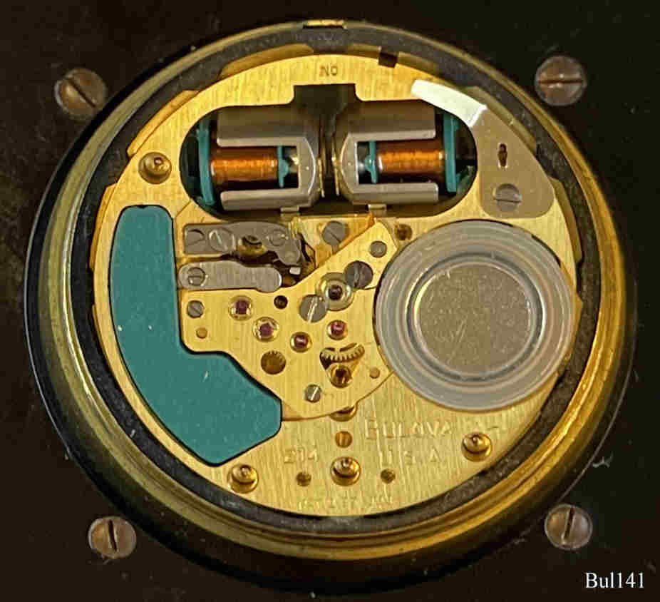 Bulova 214 mounted into a gilted brass desk clock, signed front: ”€¯Accutron”, back: no signature, inside: ”Bulova, 214, USA, Pat.:2.971.323, N0”€¯, Caliber 2140, Manufacturing date 1970 (N0), scew-on case back, clip lever on the back to adjust the time. It is a normal 214 movement as it was designed for watches, only mounted into a desk clock. Engraved on the caserim: ”1950 - 1965 Malcolm A. Stevenson”€¯