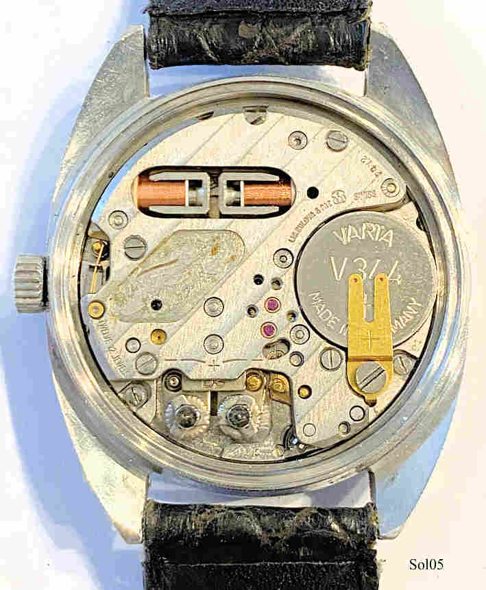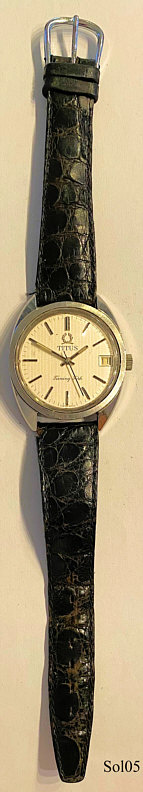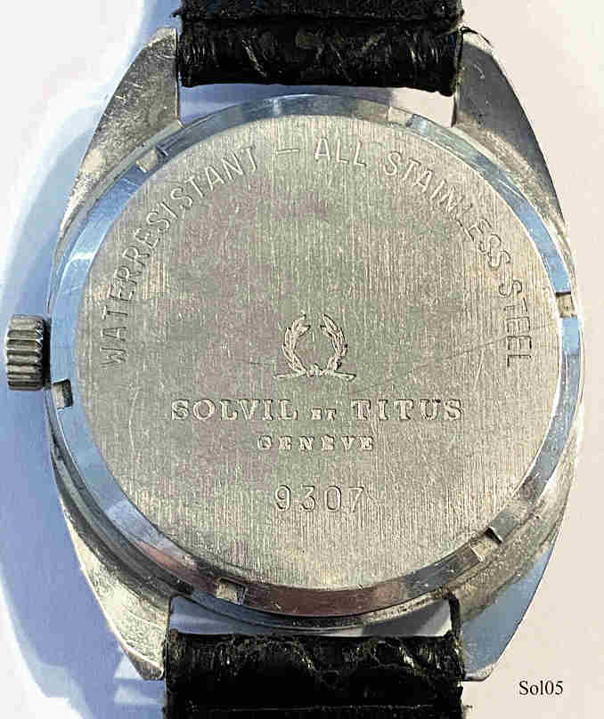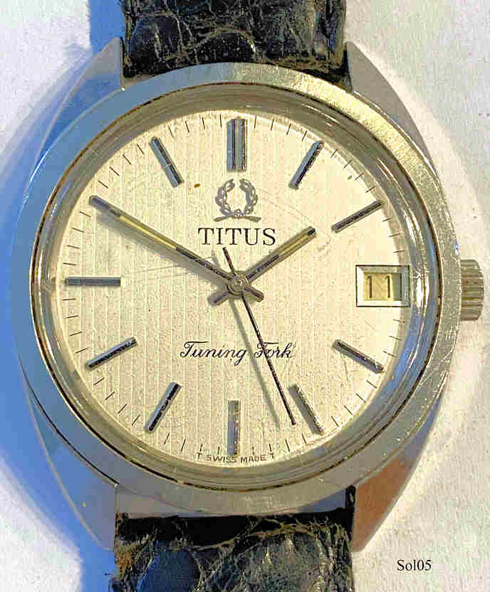 Dies ist eine Solvil et Titus Tuning Fork, eine Schweizer Stimmgabeluhr mit dem ETA 9162 Werk. Caliber 9162, Referenz Nr.: 9307, Edelstahlgehäuse, stainless steel back. Beschriftet vorn: ”TITUS, Tuning Fork, Swiss Made”, hinten: ”Waterresistant, all Stainless Steel, Solvil et Titus, Genève, 9307”, innen: “Twelve Jewels, 9162, US Bulova & Pat. Swiss”.
