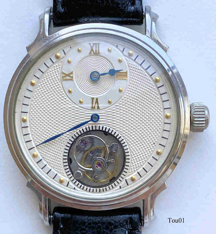 A handwind watch with “flying minute tourbillon” from China. The tourbillon is an invention of Abraham Louis Breguet, as flying minute tourbillon extended by the watchmakers-teacher Alfred Helwig. The tourbillon makes sure that the balance changes its position to the earth gravity, it is a cage, containing the balance, the anchor and the anchor wheel, that turns around once a minute. So the cage also is used as a second hand. Stainless steel case with screw-on backand black leather band. No signature inside or out.