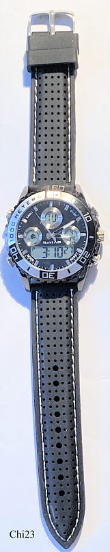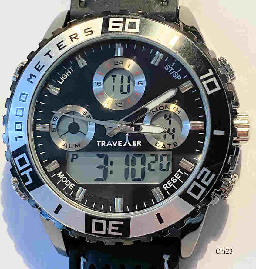 A Traveller Ana-Digi Chronograph. Stainless Steel case, signed front: ”Travellert”, inside: 2017/12 ”, back: ”Traveller, Stainless Steel”. At 6 an LCD Display to show the funktions, at 3 an eye for Month/Day, at 12 an eye for the weekday, at 9 an eye for additional functions: Stopwatch, Chrono, Alarm. A special rubber band.