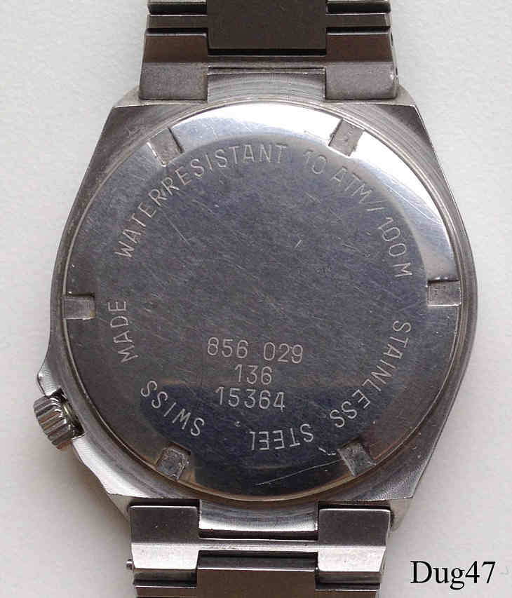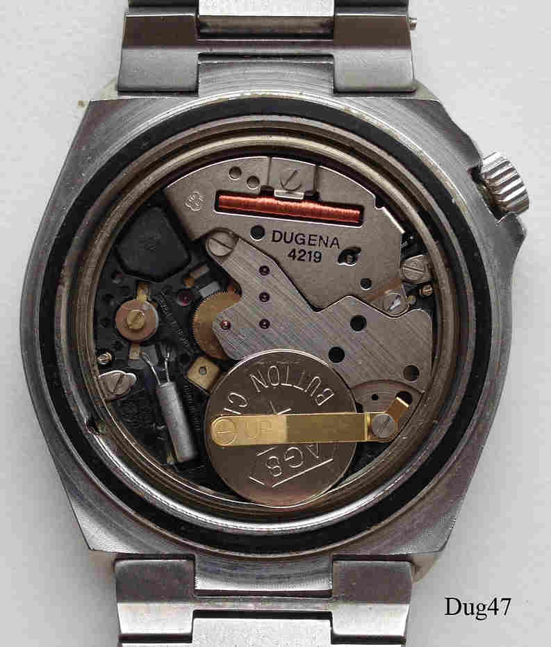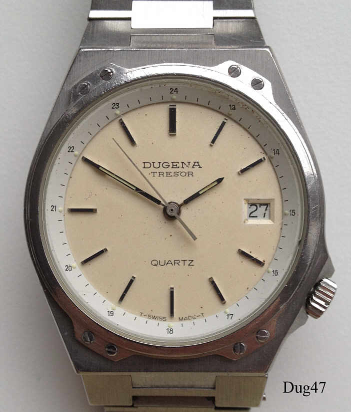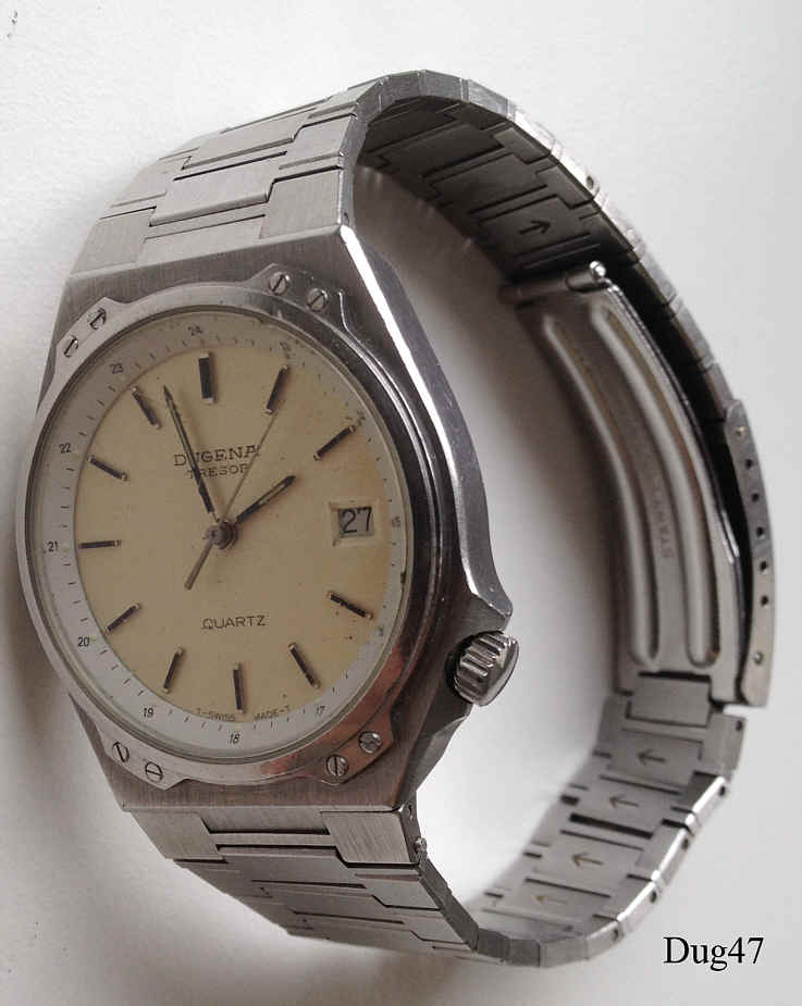 Eine Dugena Herren Quartzuhr mit Edelstahl Gehäuse, Modell Tresor. Kaliber Dugena 4219 oder ETA 944.111. Beschriftung vorn “Dugena, Tresor, Quartz, T-Swiss Made-T”, hinten: ”856029, 136, 15364, Swiss Made, Water Resistant 10 ATM/ 100M, Stainless Steel”, innen: ”Dugena 4219, ESA 944.111, Seven 7 Jewels, Unadjusted”. Edelstahl Gliederarmband.