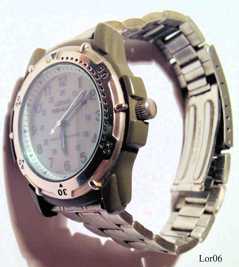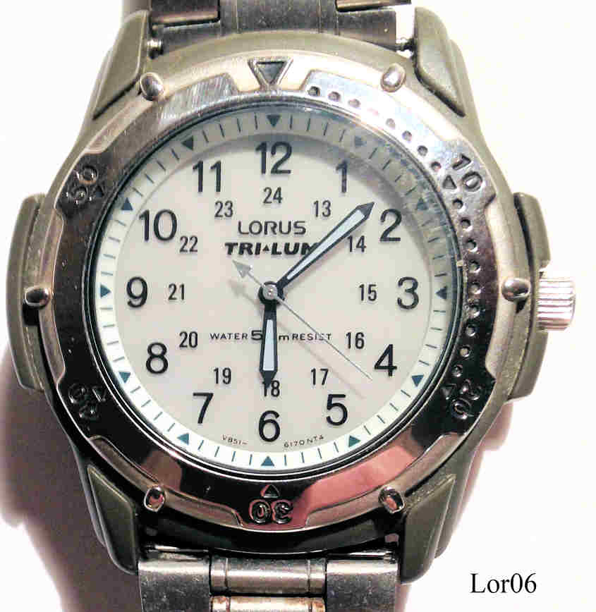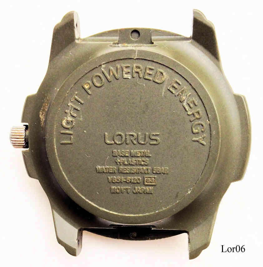 Dies ist eine Lorus Quartz Uhr mit Indiglo Zifferblatt und Solar Ladefunktion. Beschriftung vorn: ”LORUS, Tri-Lum, Water 50M Resist”, hinten: ”Light Poered Energy, Lorus, Base Metal + Plastics, Water Resistant 5 Bar, V851-6120 B3,Mov’t Japan“. Kunststoff Gehäuse mit Base Metal Ring.