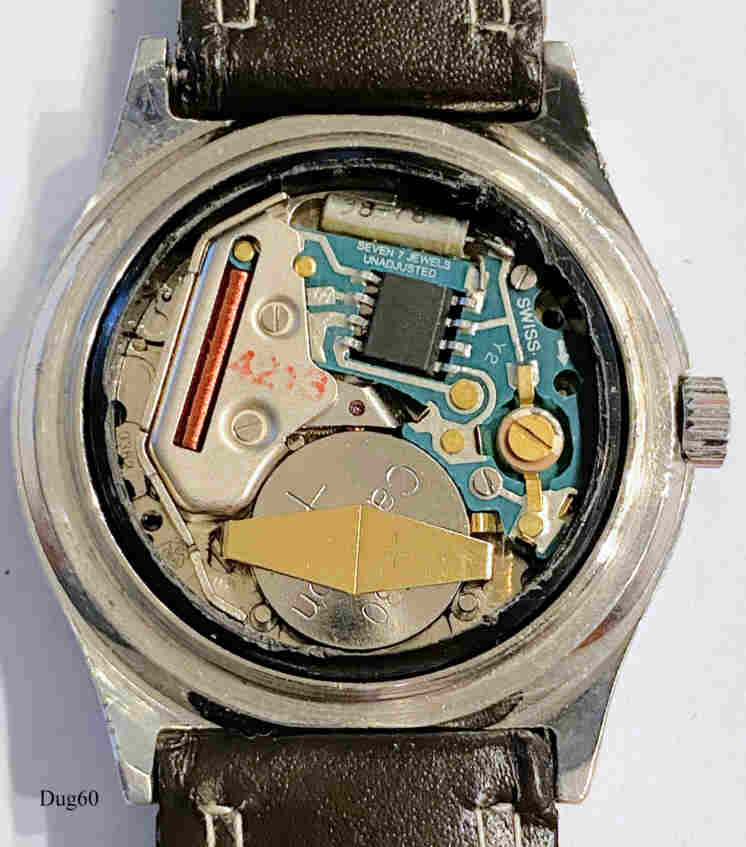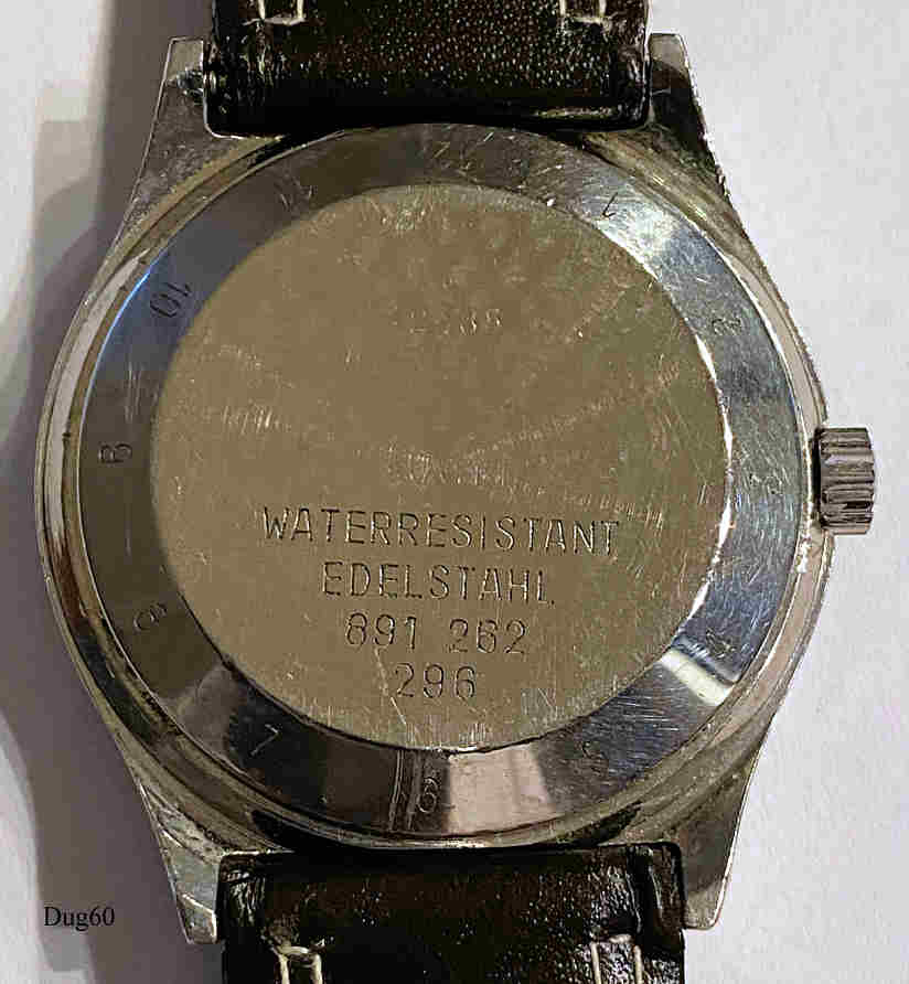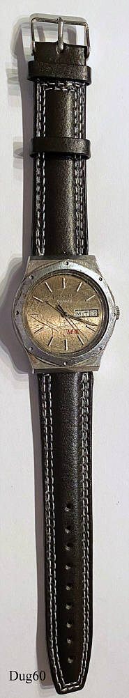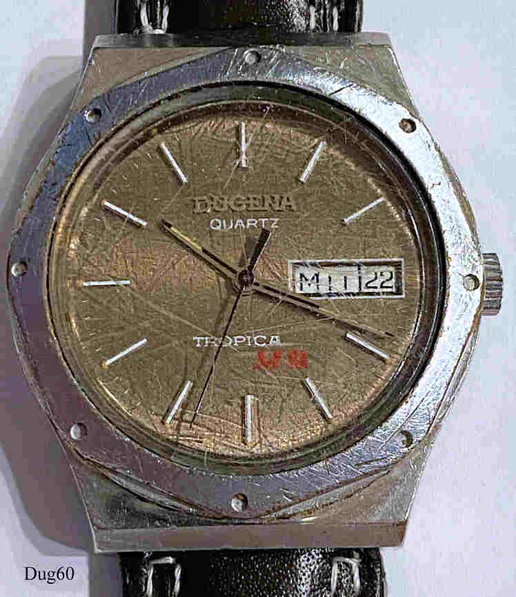 Eine Dugena Herren Quartzuhr mit Stahl Gehäuse und Lederband, Day/Date bei der 3. Caliber ETA 9362. Beschriftung vorn: “Dugena, Quartz, Tropica, MIII”, hinten: ”Water Resistant, Edelstahl, 891 262, 296”, innen: ”9362, seven 7 Jewesl, Unadjusted”. Schwarzes Lederband.