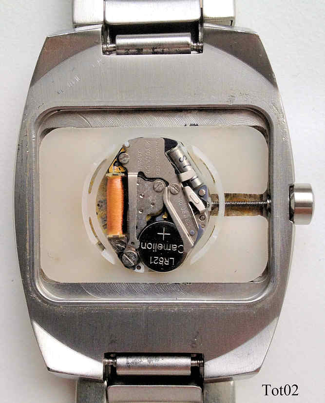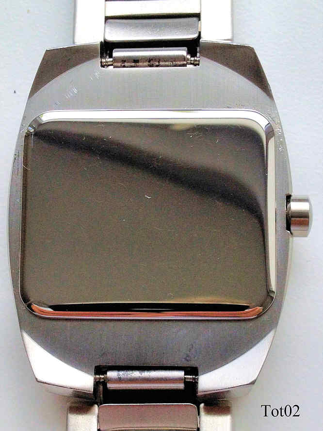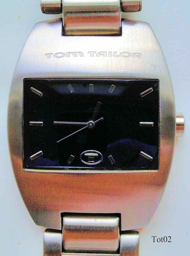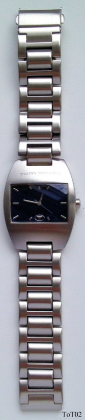 Eine Edelstahl Herrenuhr von Tom Tailor. Einfach designed, Blaues Zifferblatt mit Zahlenbalken in Silber. Beschriftet vorn: “Tom Tailor”, hinten: “”, innen: “Unadjusted, Miyota Co., Japan, No Jewels “. Edelstahl Band mit Druckschließe, einfaches Miyota Kaliber.