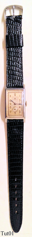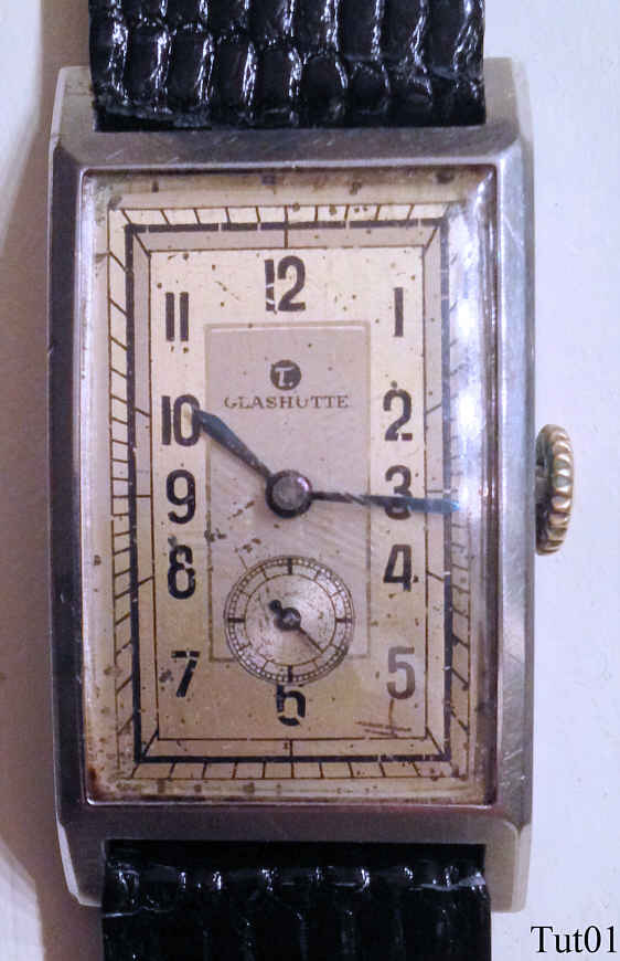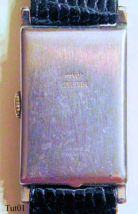 Eine schöne Edelstahl Herrenuhr von Tutima Glashütte, mit extra Sekundenzeiger bei der 6. Klappgehäuse mit Scharnier und festen Stegen. Sehr interessant die Werksabdeckung mit einem Schieber, um den Zugriff auf die Regulierung und die Schraube für die Aufzugswelle zu verdecken. Beschriftung vorn: “ T., Glashütte”, hinten: “KJ, Edelstahl, Uhrenfabrik, Glashütte, (SA)”, innen: ”Tutima, Glashütte”. Das Werk ist das sogenannte “Raumnutzwerk" Kal. Urofa 58. Die Spitzenqualitäten der UROFA - UFAG erhielten die Signatur ”Tutima". Dieser zugkräftige Name kam freilich nicht von ungefähr. Die Gründer hatten ihn vom lateinischen Adjektiv ”tutus" abgeleitet. Und das steht für ”sicher, geschützt".