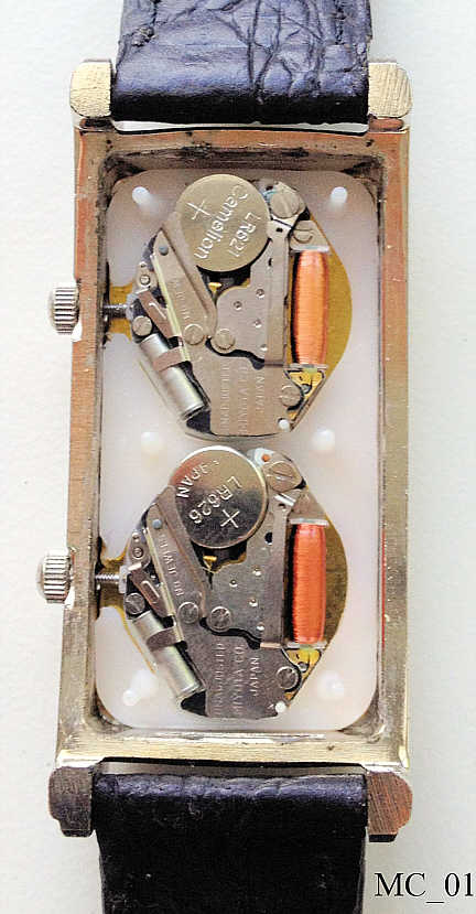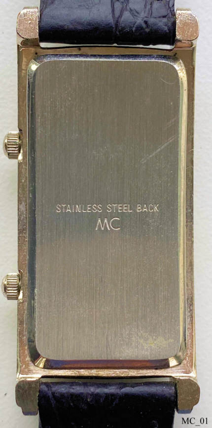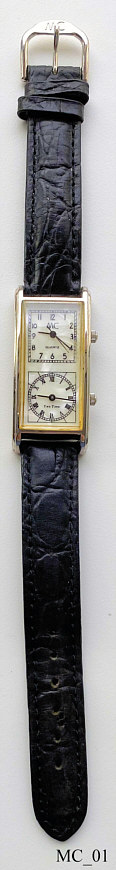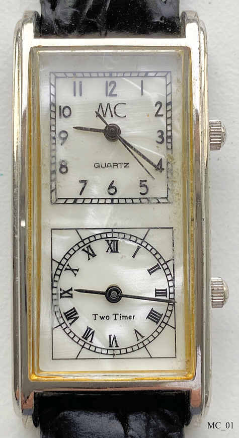Eine schöne Quartzuhr mit zwei Uhrwerken und Perlmutt Zifferblatt der Marke MC. Die Uhrwerke sind unabhängig von einander, somit hat man zwei Zeitzonen auf einen Blick. Beschriftung vorn: “MC, Quartz, Two Timer”, innen: ”Unadjusted, Miyota Co., Japan, No Jewels”, hinten: “Stainless Steel Back, MC”. Schwarzes Lederarmband