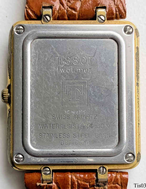 Eine Tissot Twotimer Uhr ohne Zifferblatt mit Base Metal Gehäuse und Stainless Steel Back. Das Digitaldisplay zeigt 5 verschiedene Funktionen: Zeit 1, Zeit 2, Timer, Chronograph und Alarm. Die Einstellung erfolgt über die Krone: in Normalstellung wird die Anzeige umgeschaltet, in gezogener Stellung werden die Einstellungen vorgenommen und durch Drücken wird die Funktion eingeschaltet (Alarm etc.) Beschriftet: “Tissot, T1, TM, T2, CH, AL” hinten: ”TISSOT, Swiss Quartz, Waterresistant 3 ATM, Stainless Steel, Back, D 374687 0”. Werk ETA Kaliber 958.335.