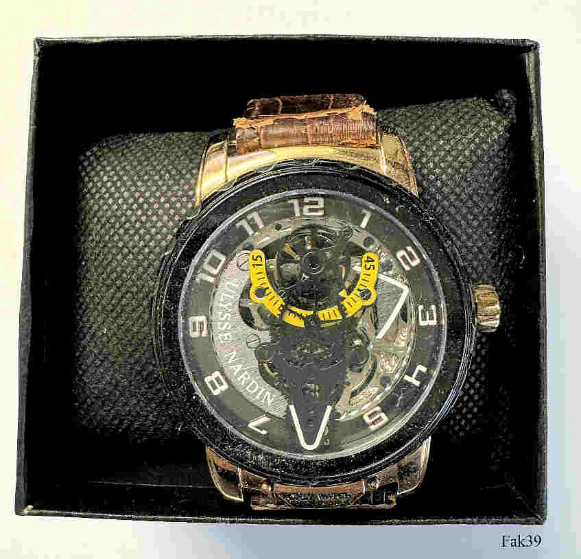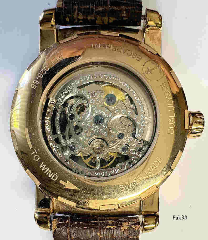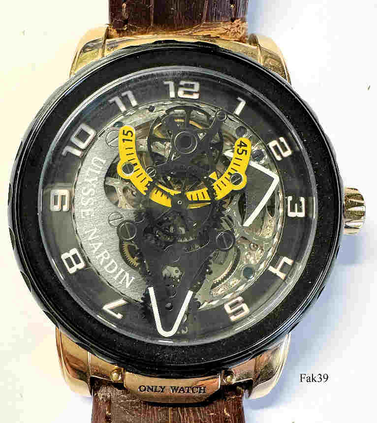 Dies ist ein optischer Nachbau der Ulysse Nardin Freak, funktional ausgerüstet mit einem schön ziselierten Automatikwerk.. Der voluminöse Minutenzeiger imitiert das Tourbillon Escapement des Originalmodells, ohne eigene Funktion. Beschriftet vorn: ”Ulysse Nardin, Only Watch”, innen: ” “. hinten: “Dual Ulysse Escapement, Swiss Made, REF. 026-88, To Wind -->” . Braunes Montblanc Lederarmband.