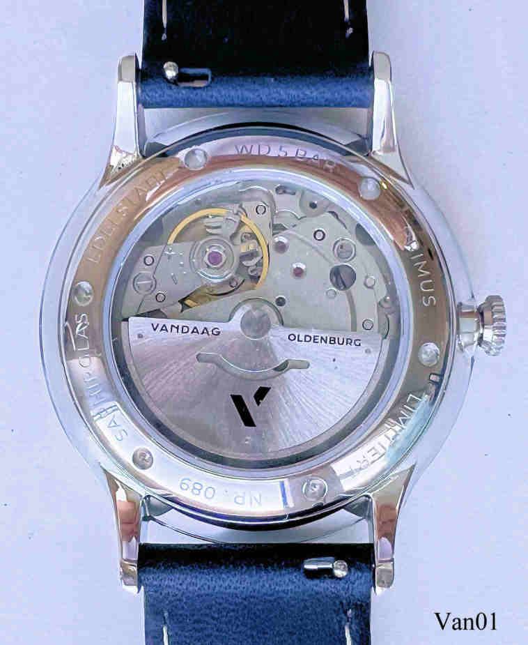 Vandaag ist seit 2020 eine neue Marke aus Oldenburg, der Name ist Niederdeutsch und meint “Heute”. Dies ist eine Automaticuhr, Modell Primus mit einem Miyota 821A Werk, Kalender bei der 6. Beschriftet vorn: “Vandaag, Automatic.”, hinten: “Primus, Limitiert, Nr. 089, Saphirglas, Edelstahl, WD 5 Bar”, innen: “Vandaag, Oldenburg”. Dieses Modell ist auf 999 Stück limitiert und ist Nummer 089.