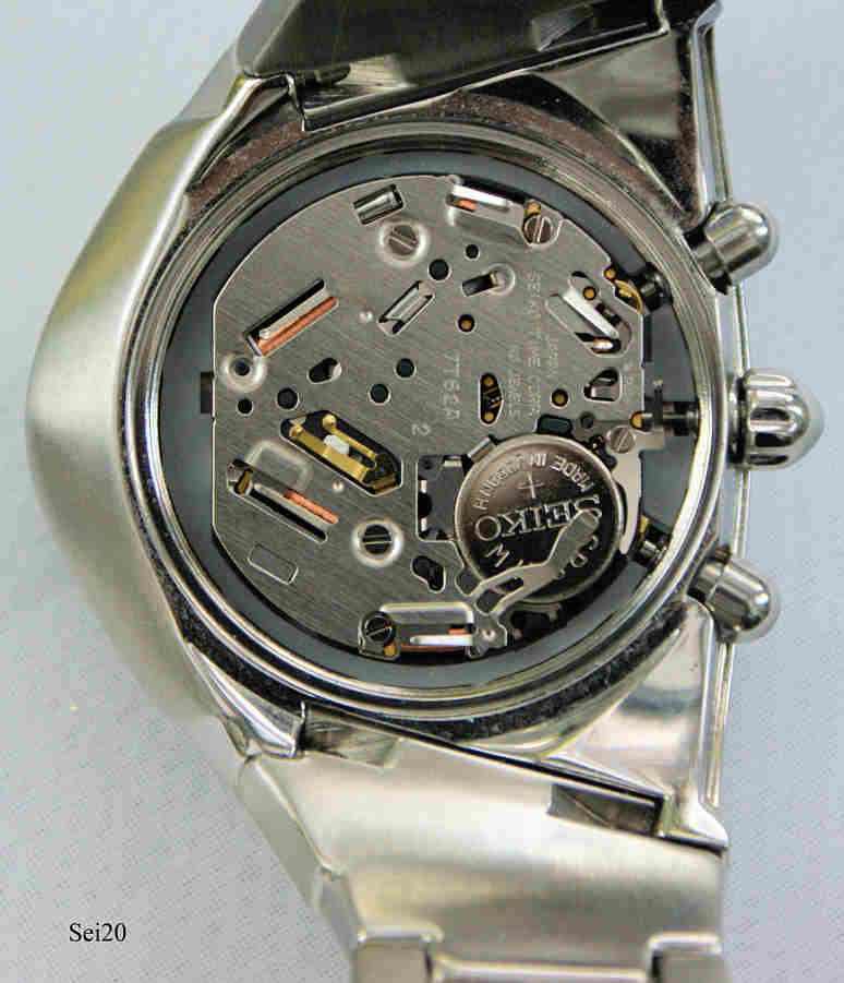 Ein Seiko Ventura Alarm Chronograph mit Edelstahl Gehäuse und Back. Kaliber Miyota 7T62, Datum bei der 3, Beschriftung vorn: “Seiko, Chronograph, 100M, Mvt.Japan, 7T62 0JJB HR 2”, hinten: “ Seiko, 770178, Water Resistant, 10 Bar, StainlessSteel, Movement Japan, 7T62 - 0GH0, A0”. spezielles, der Form der Uhr angepaßtes Edelstahl Armband. Funktionen: Uhrzeit / Kalender, Alarm, Stoppuhr, zweite Zeitzone. Alarm Einstellung und zweite Zeitzone wird auf dem unteren kleinen Zifferblatt eingestellt, Stoppuhr bis 30 Minuten, der Zentral-Sekundenzeiger zeigt 1/10 Sekunde und das obere Zifferblatt die Minuten bis 60. Das mittlere Zifferblatt zeigt die Sekunden. Diese Uhr ist eine Design Hommage auf die legendäre Hamilton Pacer / Ventura, eine der allerersten elektrischen Armbanduhren der Welt.