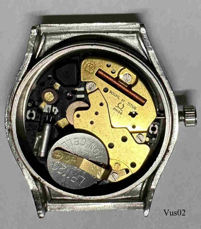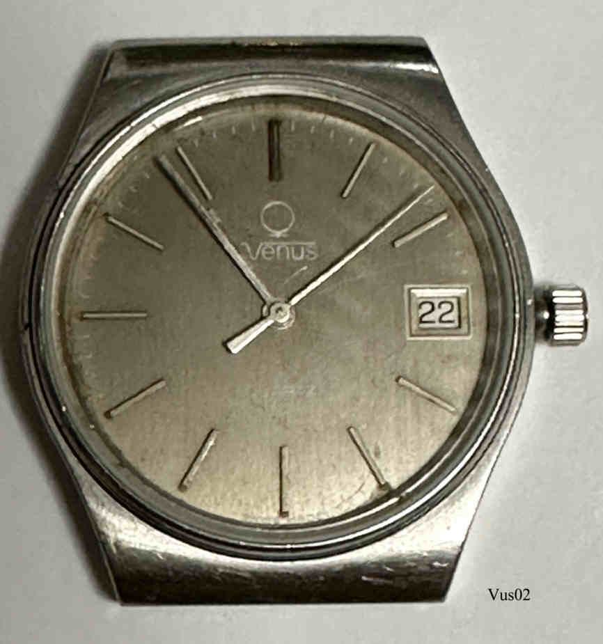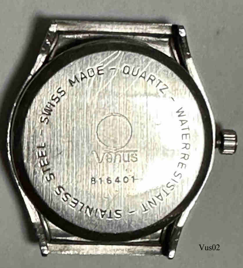Eine Herren Quartz Uhr mit Edelstahl Gehäuse der Marke Venus. Graues Zifferblatt mit Balken statt Ziffern, Datum bei der 3, Beschriftung vorn: “Venus, Quartz”, hinten: ”Stainless Steel, Swiss Made, Quartz, Water Resistant,Venus, 816401”, innen: “Solvil et Titus, Swiss, ESA, 944.111, Y2, Seven 7 Jewels, Unadjusted”.
