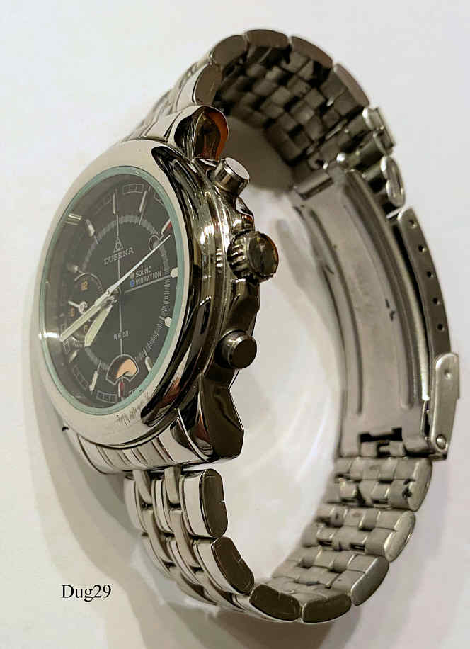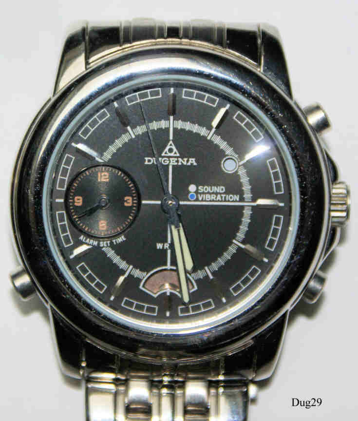 Eine Dugena Herren Quartzuhr mit Sound und Vibrations Alarm, Stainless Steel Gehäuse. Beschriftung vorn: “Dugena, Sound, Vibration, WR100”, hinten: ”Water Resistant, 50M, Stainless Steel, 1895320, 42, Cal. AW00”, innen: ”AW00, unadjusted”. Edelstahl Armband mit Dugena Faltschließe. Auf dem kleinen Zifferblatt wird die Alarmzeit eingestellt. Kaliber Miyota AW00