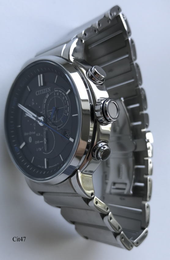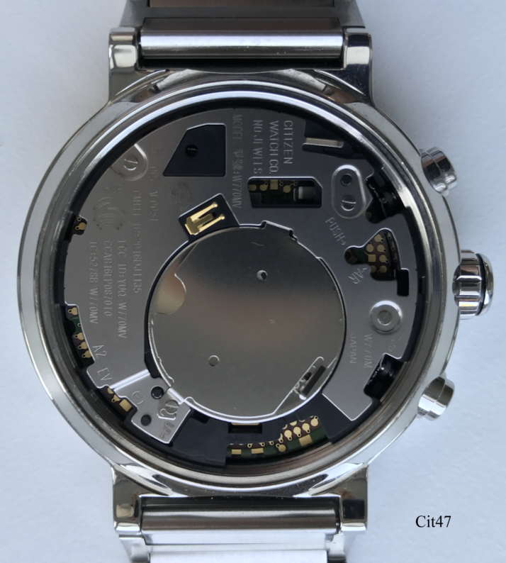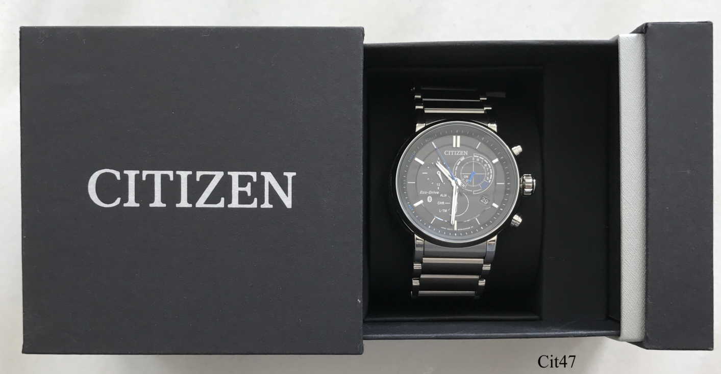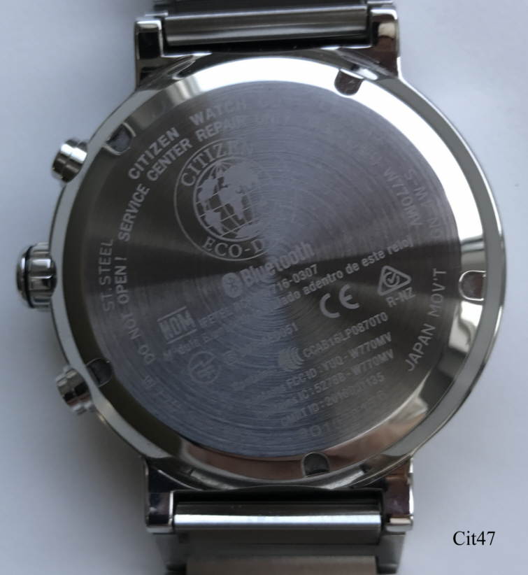 Eine Citizen Eco-Drive Bluetooth Smartwatch, koppelt mit iOS und Android Telefonen und überträgt Signale vom Handy auf die Uhr Kaliber Citizen W770MV, mit Analoganzeige, Beschriftung vorn: “Citizen, Eco-Drive, Japan Movt. W770- S147439 EY“, hinten: “ Citizen Watch Co.,W.R. 10 Bar, GN-4-WS, Japan Mov’t.,601020176, W770-S108837, St.Steel Citizen ECO Drive, Bluetooth, div. Funkzeichen”, innen: “Citizen Watch Co., No Jewels, Model W770MV, IC 5278B-W770MV”. Edelstahl Armband mit Schmetterlingsschließe. Die Stromversorgung erfolgt als Eco-Drive über Solarzelle im Zifferblatt und Accu.