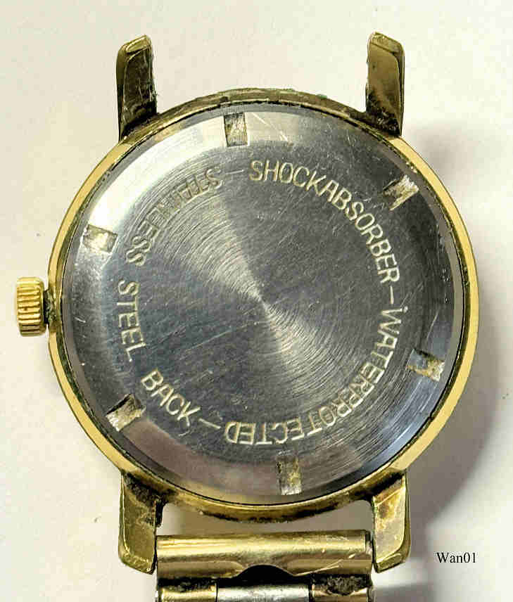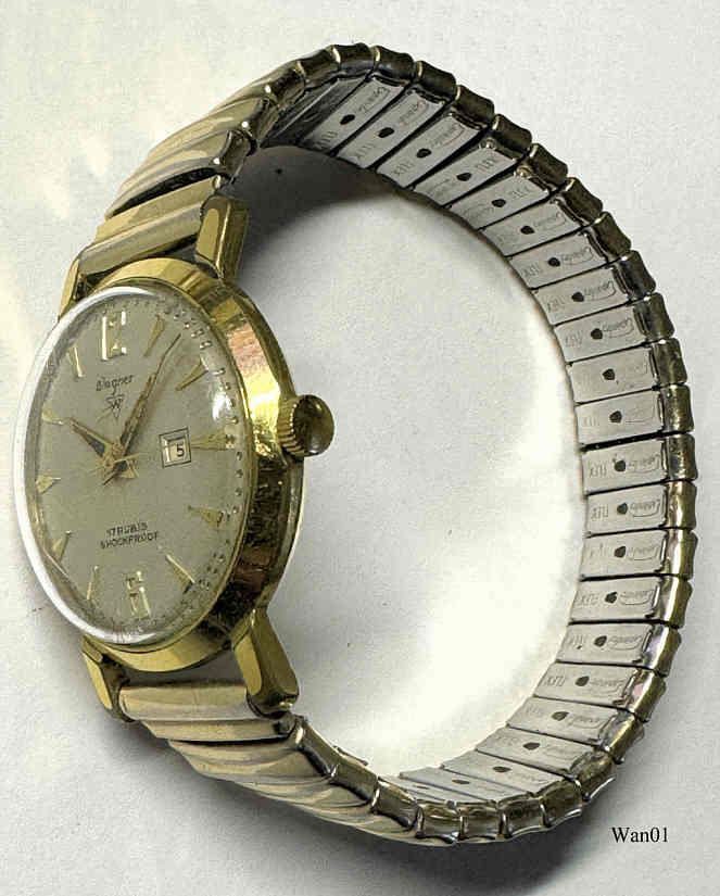 Eine Herren Handaufzugsuhr der Ernst Wagner OHG, Pforzheim. Vergoldetes Gehäuse, Kalender bei der 3. Beschriftet vorn: ”Wagner, 17 Rubis, Shockproof”€¯, hinten: ”Stainless Steel Back, Shockabsorber, Water Protected”¯, innen: ”17 Jewels, 44”. Kaliber Wagneer 44, Expandro Flex Band.