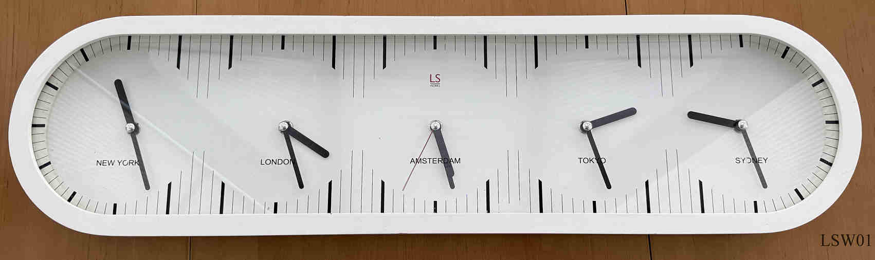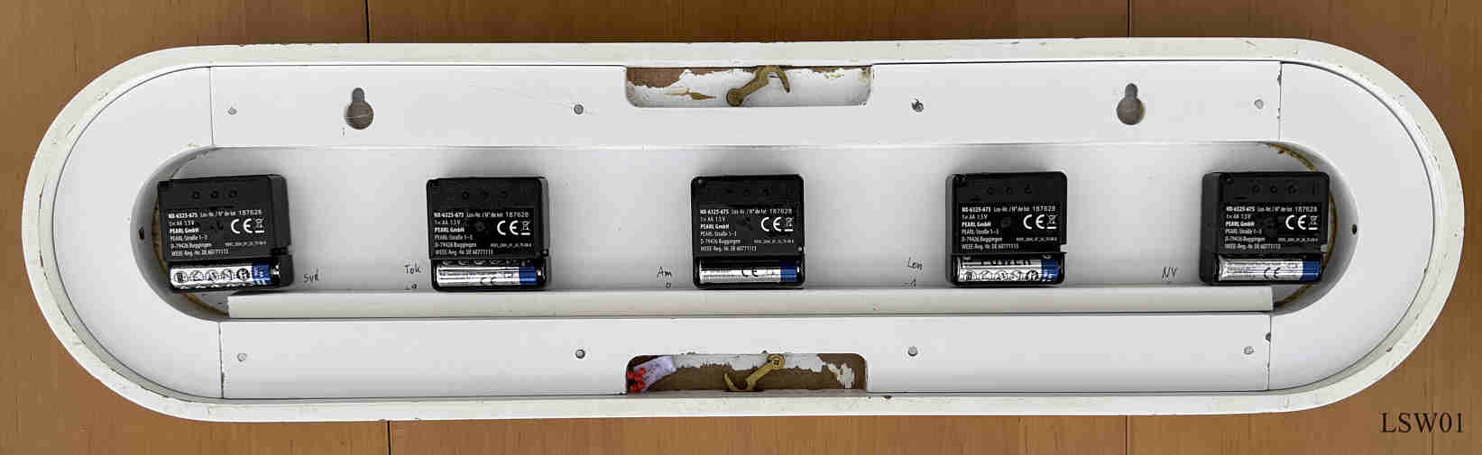 Dies ist eine Weltzeituhr wie sie in Hotels oder anderen öffentlichen Gebäuden gezeigt wird. Gezeigt wird die Zeit von New York, London, Amsterdam, Tokyo und Sydney. Ursprünglich bestückt mit 5 einfachen Quartzwerken, wobei nach relativ kurzer Zeit die Minutenzeiger nicht mehr synchronisiert laufen. Deshalb habe ich die Uhrwerke gegen Funkuhrwerke ausgetauscht. Speziell angefertigtes Holzgehäuse mit abnehmberer Rückwand zum Batteriewechsel.