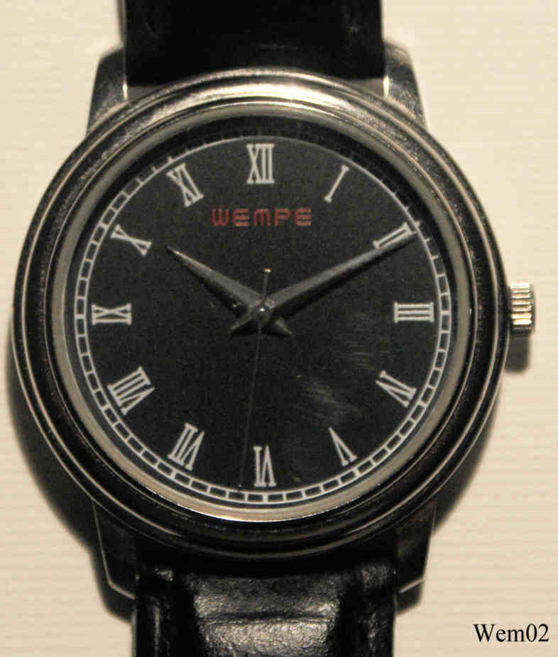 Eine Wempe Quartz Werbeuhr mit einem einfachen Quartzwerk. Aufschrift “Wempe” Hinten:”Stainless Steel Back, Wempe, With Compliments, CE” Schwarzes Lederarmband.