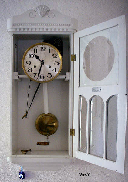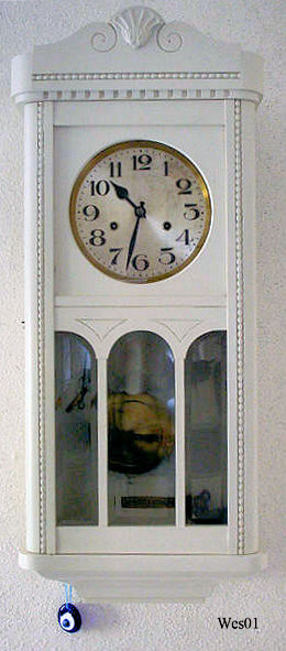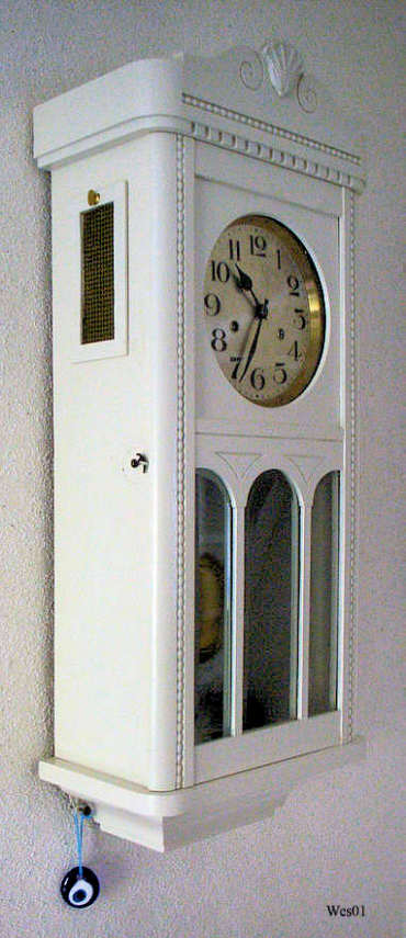 This is a beautiful Wallclock with a 3/4 Westminster Gong. The clock is a heritage from my Grandfather, where it dominated the living room. Every 1/4 hour a tone sequence is played, on the hour the time was announced by a triad in the number of the hour. A very nice movement in brass with a sophisticated gong mechanism. Via a drum the Westminster gong is played and via a chain bar the hours are played. The clock was produced around 1910, strill working. The wooden cabinet was originally stained in black.