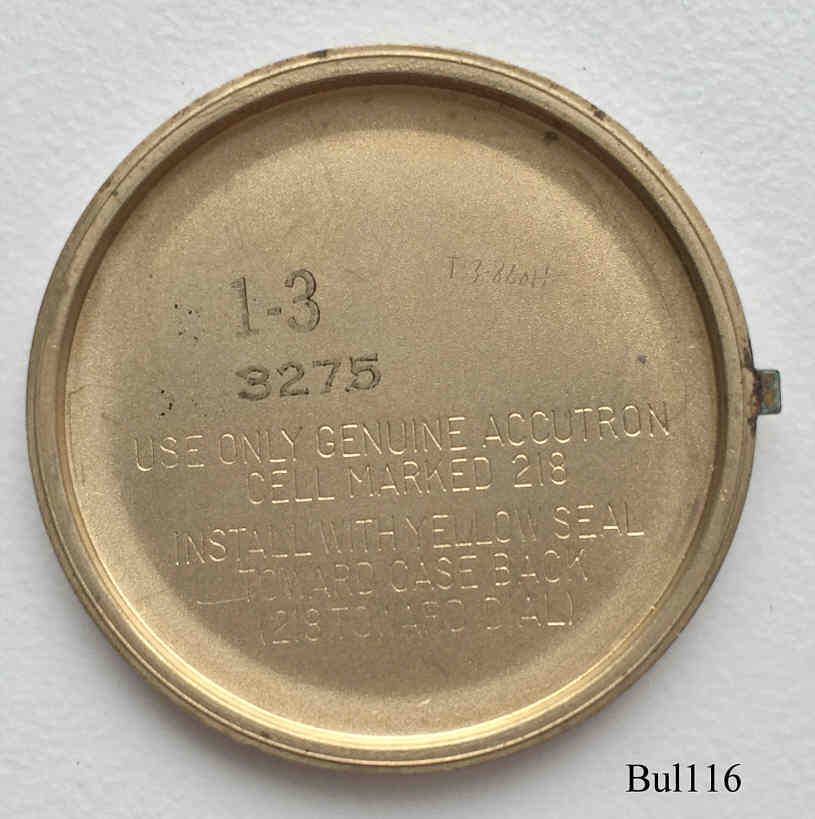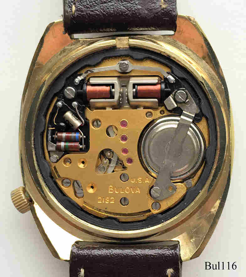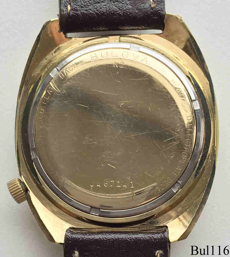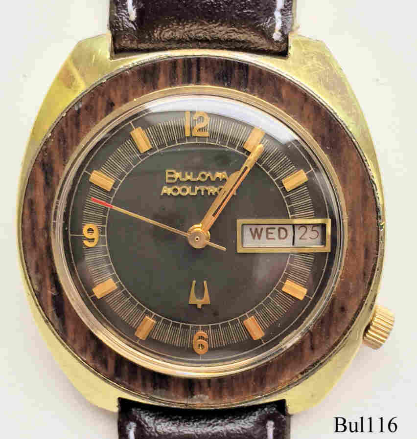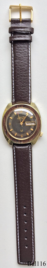 Eine Bulova Accutron mit Base Metal Gehäuse und einem Teakholz Ring um das Zifferblatt, deshalb auch genannt ”Woody”. Beschriftet vorn: “Bulova, Accutron”, hinten: “Bulova, Heavy Gold Electroplate Bezel, 10K Rolled Gold Plate Back, N2, J467141”, innen: “USA, Bulova, 2182”, Case #3275, Caliber 2182, Herstelldatum 1972 (N2), verschraubter Boden, Krone bei der 4, Day/Date in weiß bei der 3, braunes Zifferblatt, Sekundenzeiger mit roter Spitze, braunes Leder-Armband.