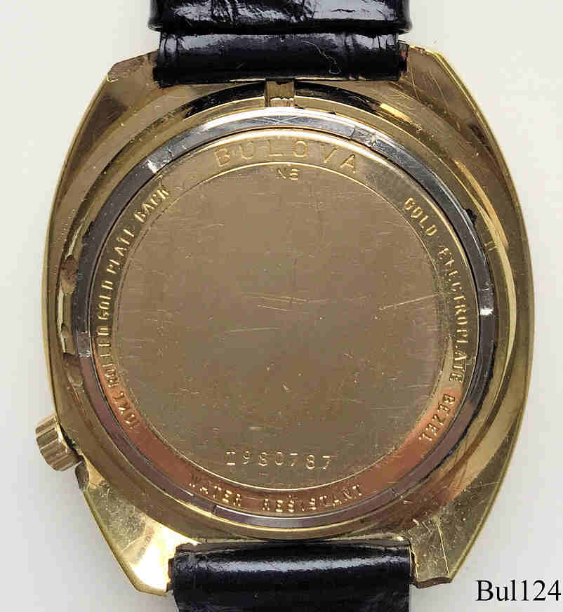 Eine Bulova Accutron mit Base Metal Gehäuse und einem Teakholz Ring um das Zifferblatt, deshalb auch genannt ”Woody”. Beschriftet vorn: “Bulova, Accutron”, hinten: “Bulova, Gold Electroplate Bezel, Water Resistant, 10K Rolled Gold Plate Back, N5, I980787”, innen: “USA, Bulova, 2182”, Case #3275, Caliber 2182, Herstelldatum 1975 (N5), verschraubter Boden, Krone bei der 4, Day/Date in silber bei der 3, braunes Zifferblatt, schwarzes Leder-Armband.
