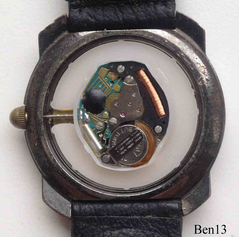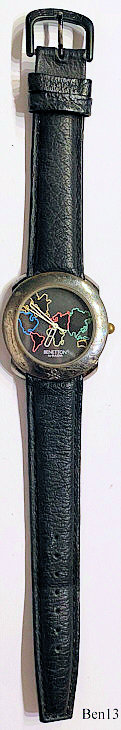 Eine Benetton by Bulova World Time, Beschriftet vorn: ”Benetton by Bulova”, hinten: ”United Colors of Benetton by Bulova, Stainless Steel Back, Water Resistant, Base Metal Bezel, Mod. Dep.”, innen: ”Swiss parts, one Jewel, Assy in Thailand”, schwarzes Lederarmband mit neutraler Schließe.