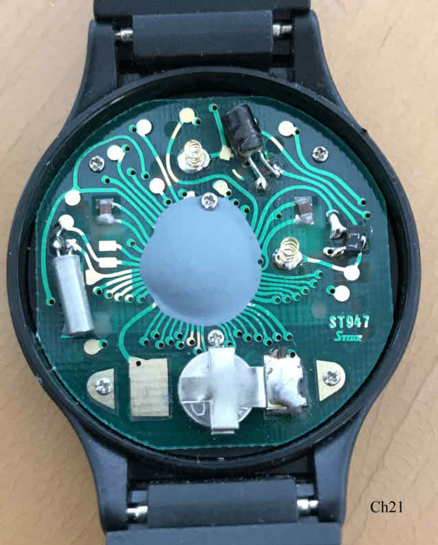 A watch of unknown heritage with worldtime, alarm and calculator. Signed front: ”World Time Alarm Calculator”,back: “ ”, inside: “ST947”. Functions: Date, time, worldtime, calculator. Plastic case with rubber band.