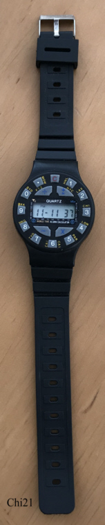 Eine Uhr unbekannter Herkunft mit Weltzeit, Wecker und Rechner. Beschriftet vorn: ”World Time Alarm Calculator”, hinten: “ ”, innen: “ST947”. Funktionen: Datum, Uhrzeit, Weltzeit, Rechner. Kunststoff Gehäuse mit Kautschuk Armband.