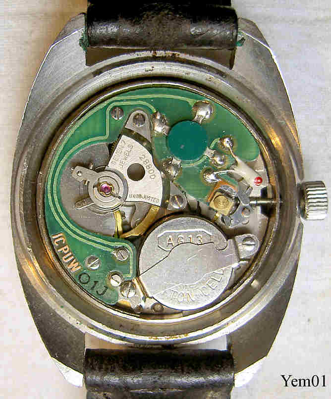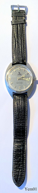 Diese Yema Transigraph arbeitet mit dem PUW 2502 Werk. Edelstahl Gehäuse mit schwarzem Lederband. Beschriftung vorn: ”Yema, Transigraph, Electronique”, hinten: ”All Stainless Steel, Antimagnetic, 364920”, innen: ”Seven 7 Jewels, 28800, Unadjusted, IC PUW 01J”