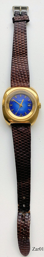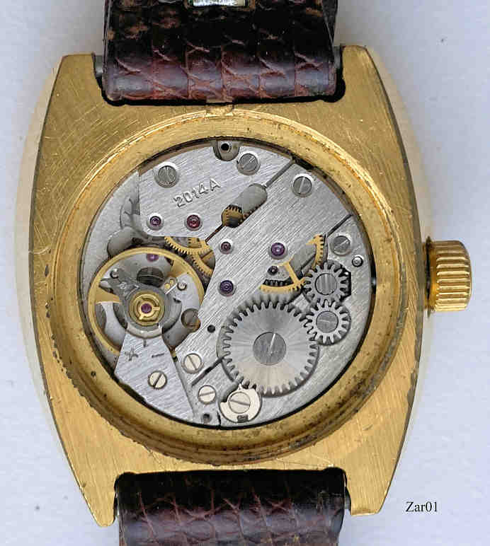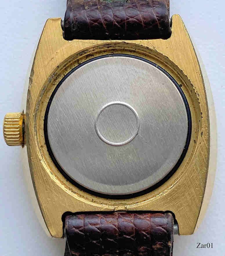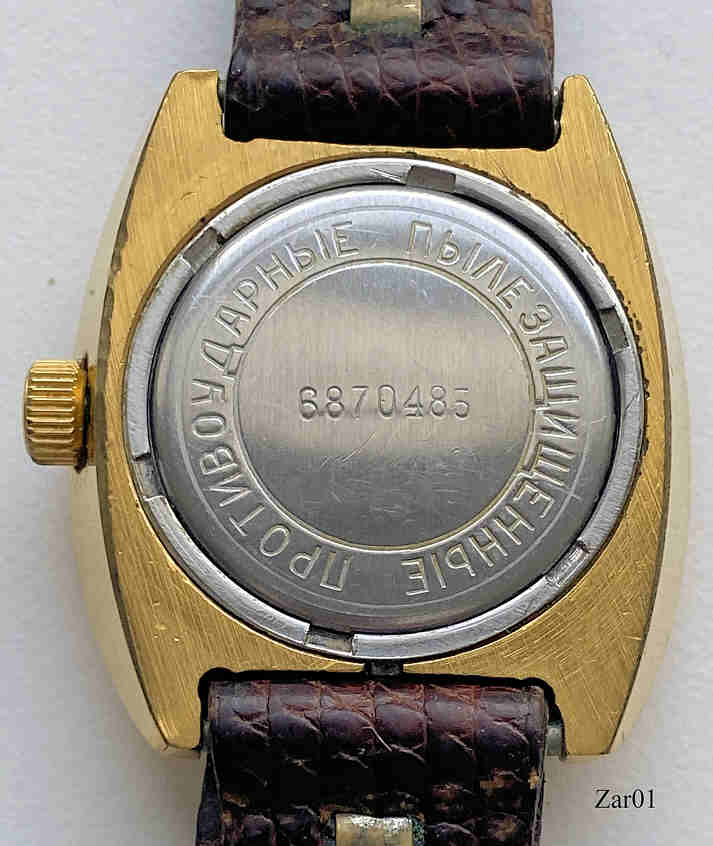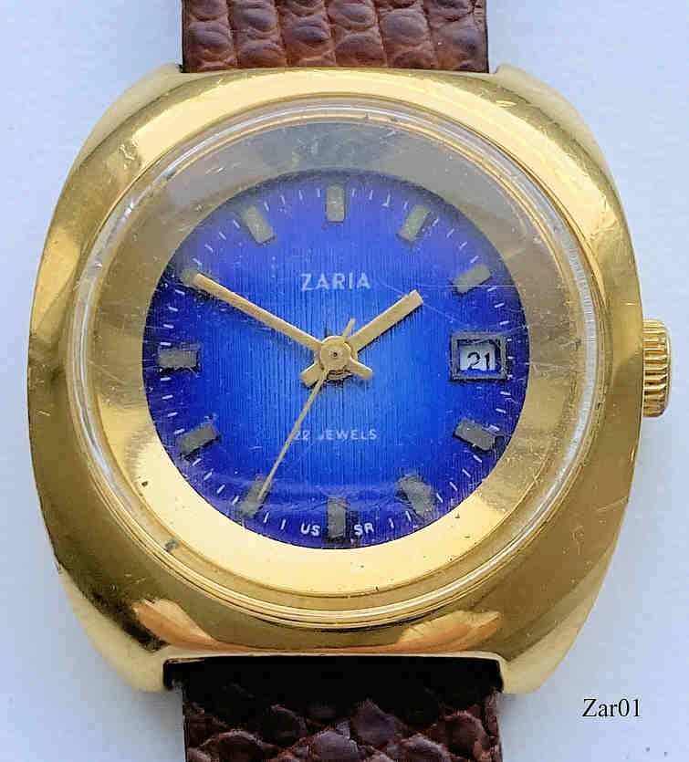 Eine interessante russische Damenuhr mit Handaufzugs Werk der Marke Zaria aus Penza. Messinggehäuse mit Schutzkappe, Edelstahlboden und Schraubring, Datum bei der 3. Beschriftet vorn: “Zaria, 22 Jewels, USSR”, hinten: “6870485“, innen: “2016A”. Kaliber Zaria 2016A.