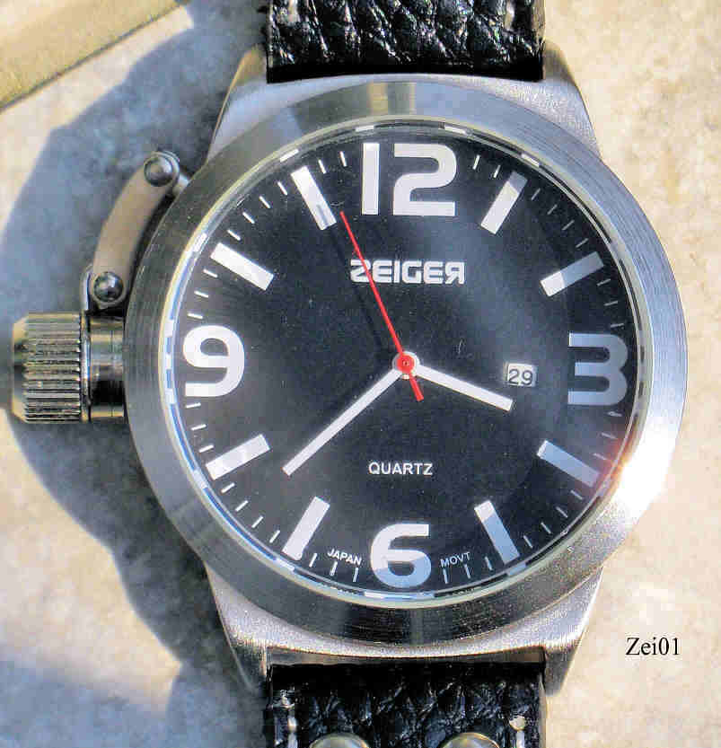 A Zeiger Quartz watch with stainless steel case und Stainless Steel Back, This watch has a screw-on cap over the crown, unusually at 9. Date at 3, signed front: ”Zeiger, Quartz”, back: ”Stainless Steel Back, Japan movt, Zeiger, 8053L”, inside: ”SIIO, PC32A, Unadjusted, No Jewels, Japan”, black Leatherband.