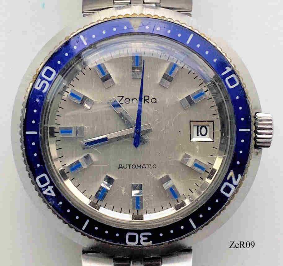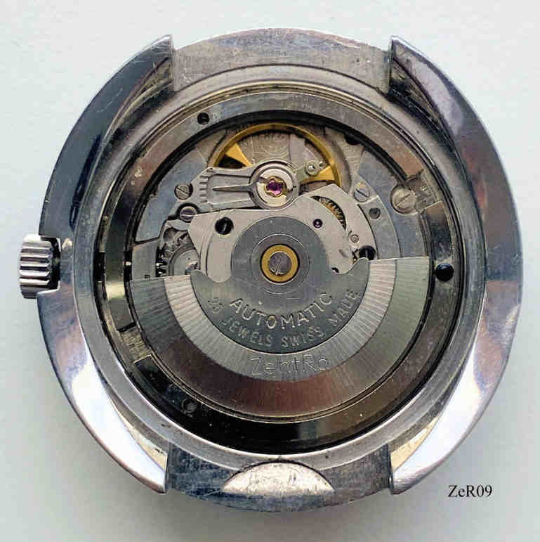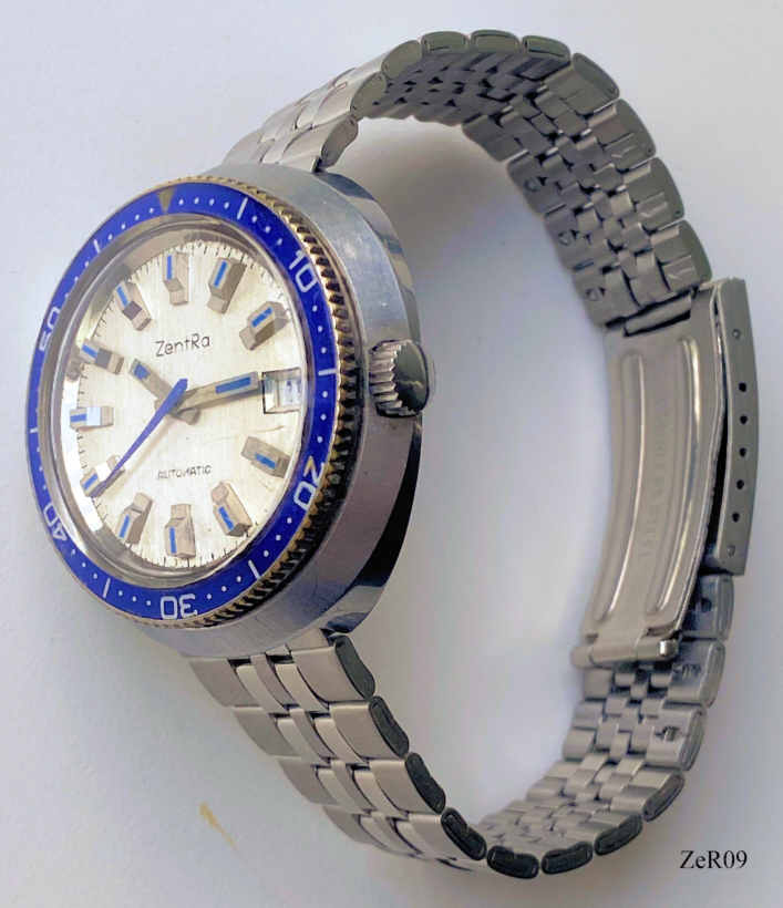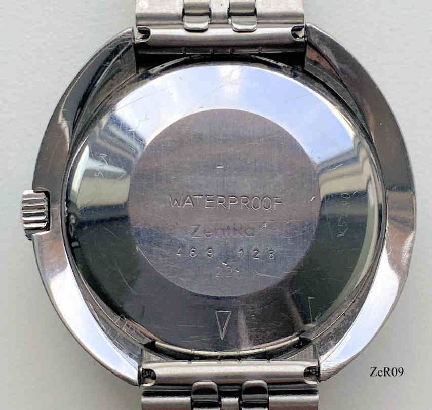 Diese ZentRa Automatic Uhr hat 25 Steine und ein ETA 2782 Werk. Kalender bei der 3, Edelstahl Gehäuse, 40mm Durchmesser, 21600 h/sec. Beschriftet vorn: “ZentRa, Automatic”, hinten: “Waterproof, ZentRa, 469 128, 22”, innen: “Automatic, 25 Jewels Swiss Made, ZentRa, ETA 2782”. Edelstahl Gliederarmband mit neutraler Schließe, ein Geschenk von Bruno Taubert.