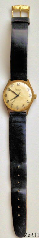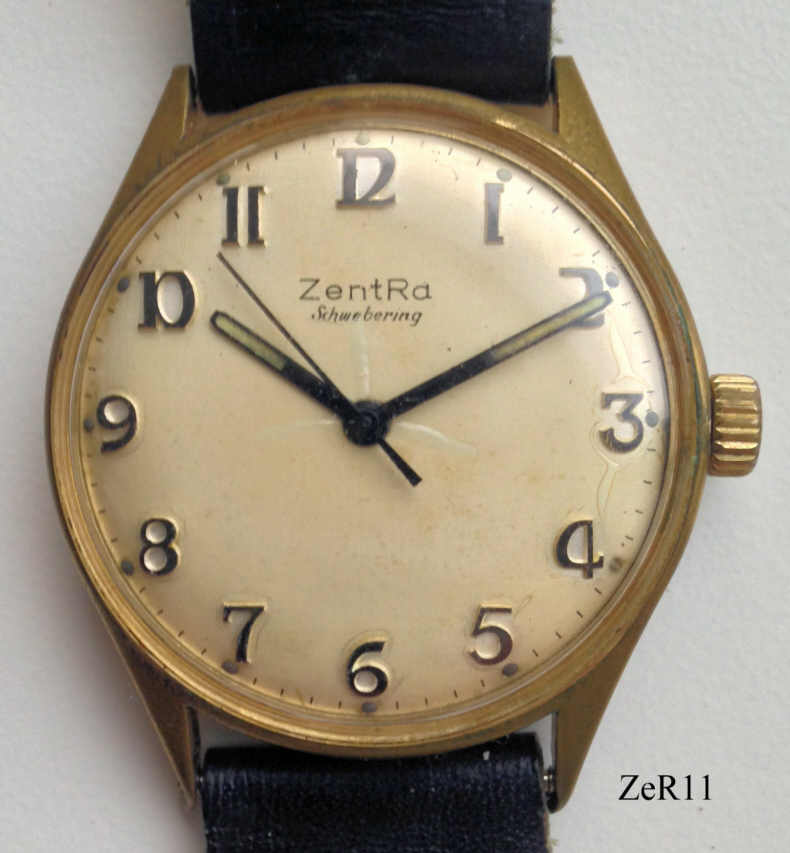 Eine schöne ZentRa Schwebering Uhr mit einem PUW360 Werk. Vergoldetes Gehäuse mit schwarzem Lederarmband. Beschriftet vorn: ”ZentRa, Schwebering”, hinten: ”ZentRa, Schwebering, D.B. Pat, Doppelt Stoßgesichert, Wassergeschützt Duopac, Stahl Boden”, innen: ”17 Jewels, PUW 360, Germany, D.B.G.M”.